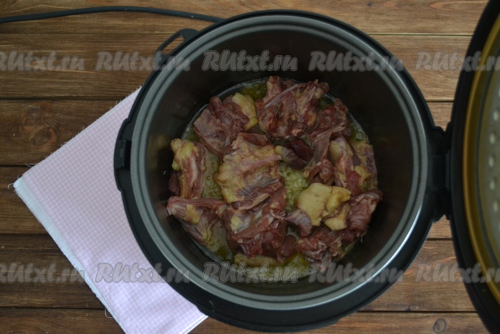 Включить мультиварку на функцию "Жарка" и, когда чаша хорошо разогреется, выложить нарезанный утиный жир. Если на утке много жира - весь использовать не нужно, иначе плов будет очень жирным, а это его не украсит. Утиный жир можно будет использовать в другом блюде, например, испечь с ним картофель.