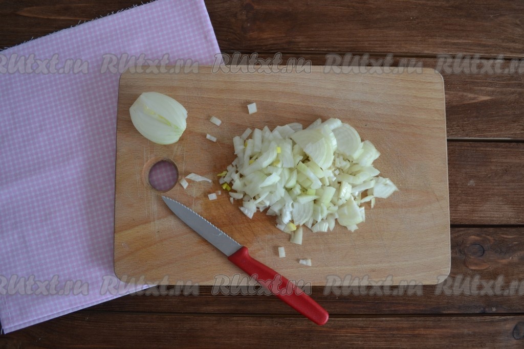 Очищенный и вымытый лук нарезать небольшими кубиками.