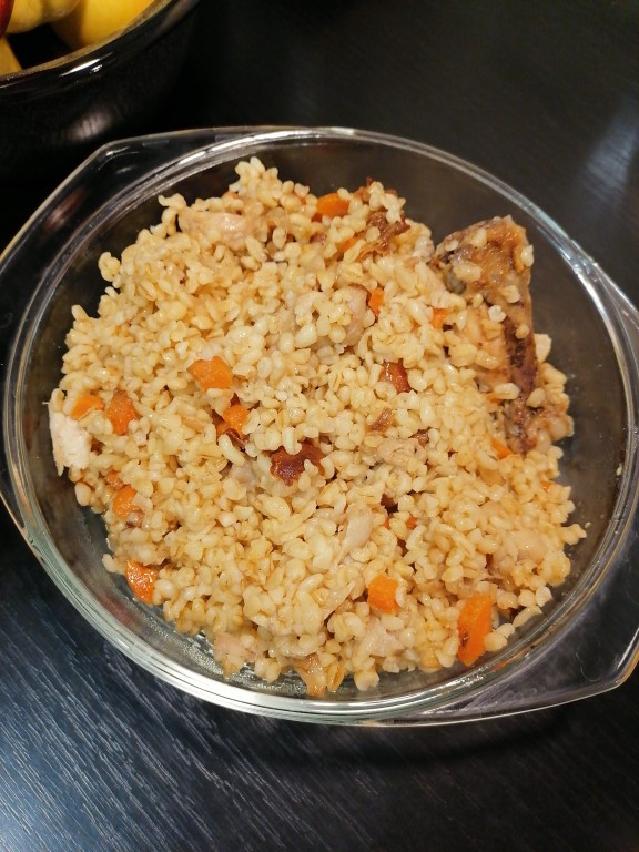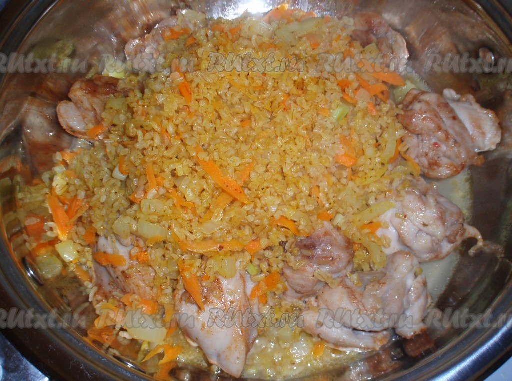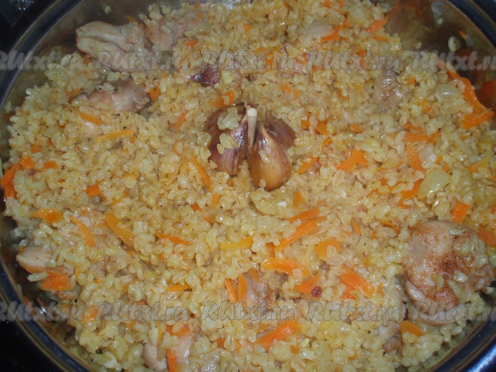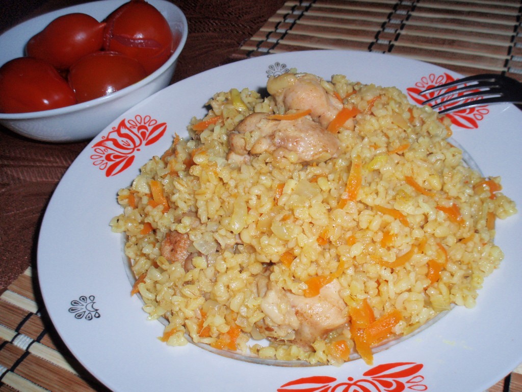 Аппетитный плов из булгура с курицей готов. Подать в горячем виде с овощным салатом или домашними соленьями.