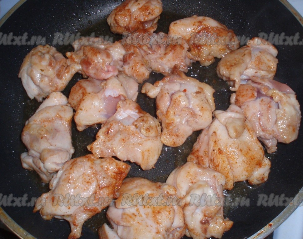 Мясо курицы нарезать на небольшие кусочки. Я использовала куриные голени, отделила мясо от костей. Мясо посолить, поперчить.