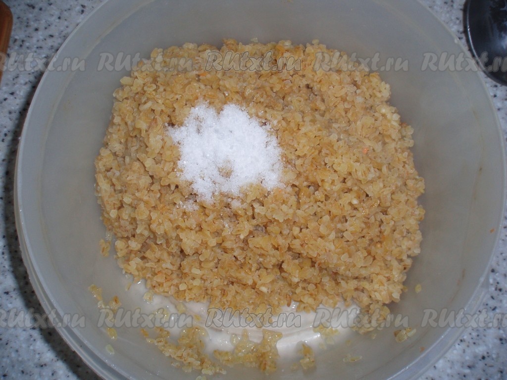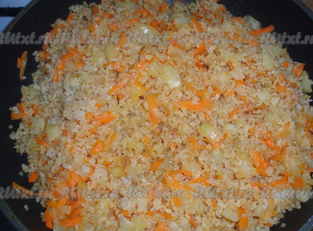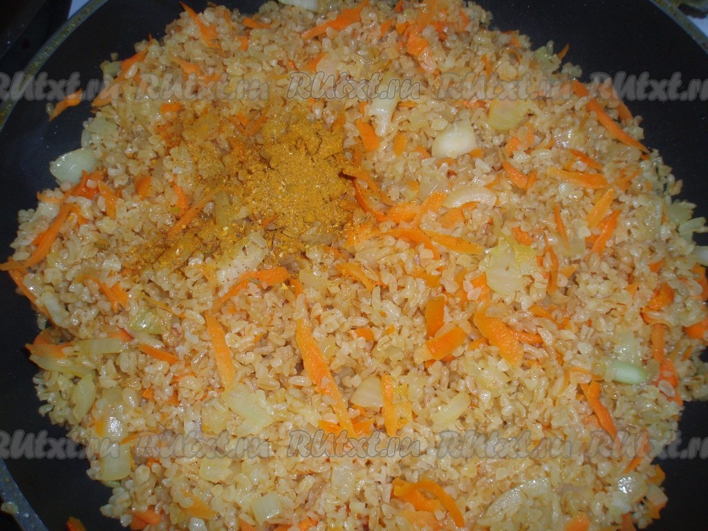 Затем к моркови и луку добавить подготовленный булгур и продолжить обжаривание. Обжаривать, пока булгур не станет рассыпчатым.