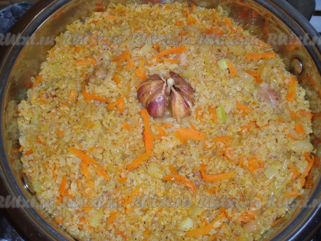 Закрыть сковороду крышкой и тушить плов на маленьком огне, примерно, 25 минут. Затем дать блюду настояться 5 минут.