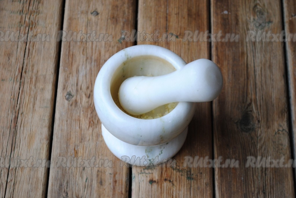Чеснок очистить и поместить в ступку, добавить щепотку соли и хорошо размять.