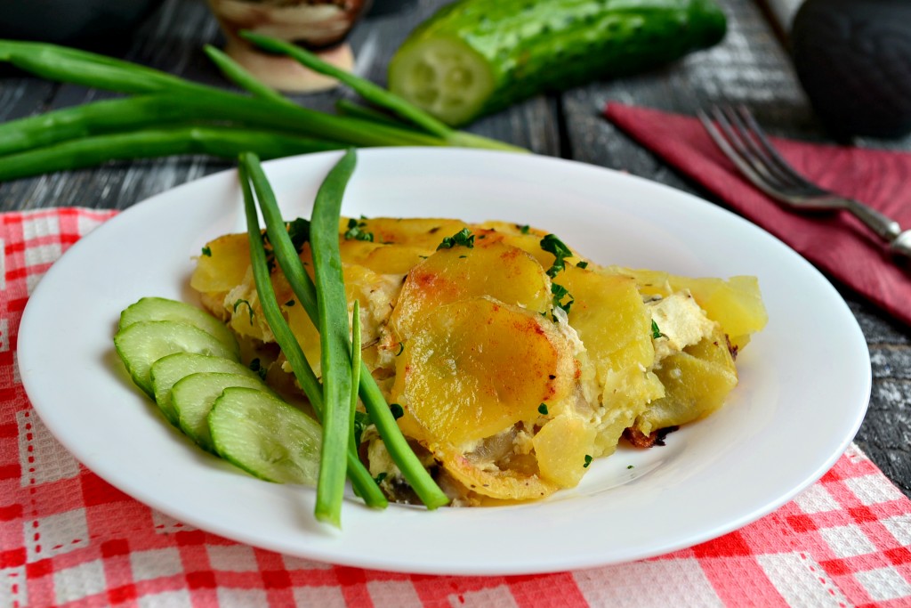 Подать вкуснейший картофельный гратен с грибами в горячем виде к столу со свежими овощами.