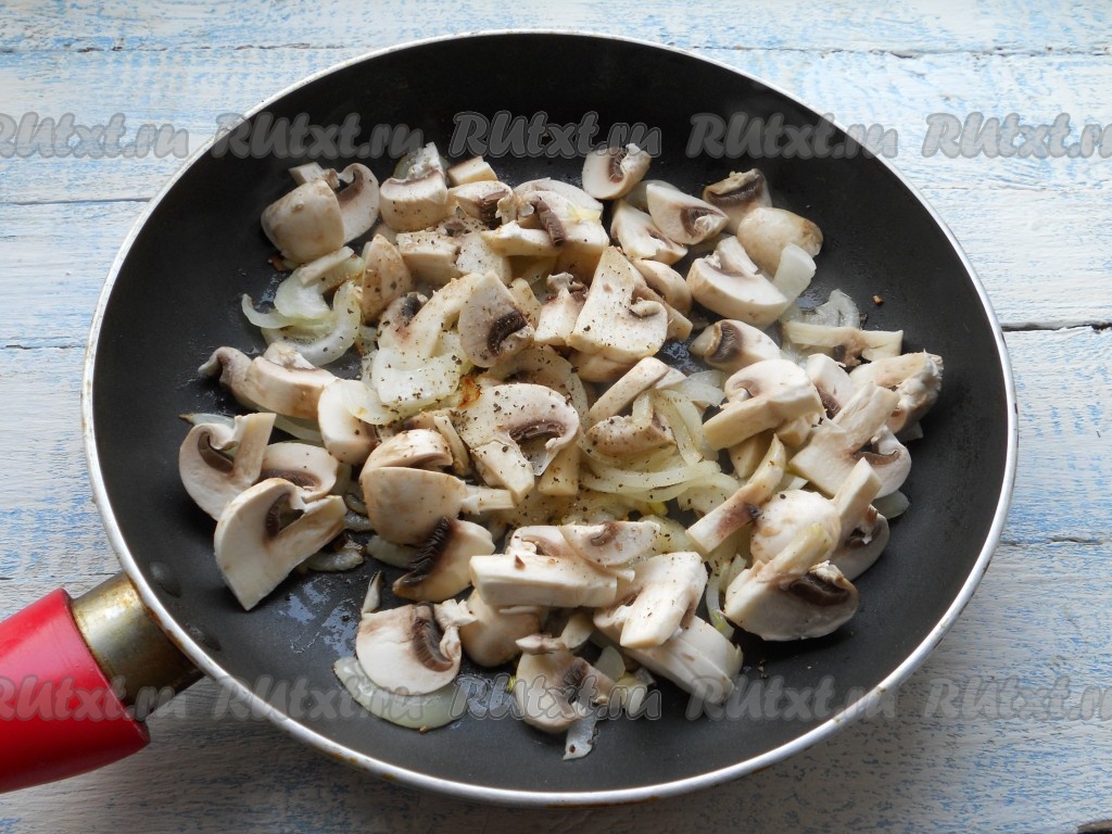 Обжарить лук до мягкости, иногда помешивая, затем добавить нарезанные (не мелко) свежие грибы, поперчить. Я использовала купленные в магазине шампиньоны, можно - лесные грибы, предварительно отваренные. Обжарить грибы с луком, помешивая, около 4-5 минут.