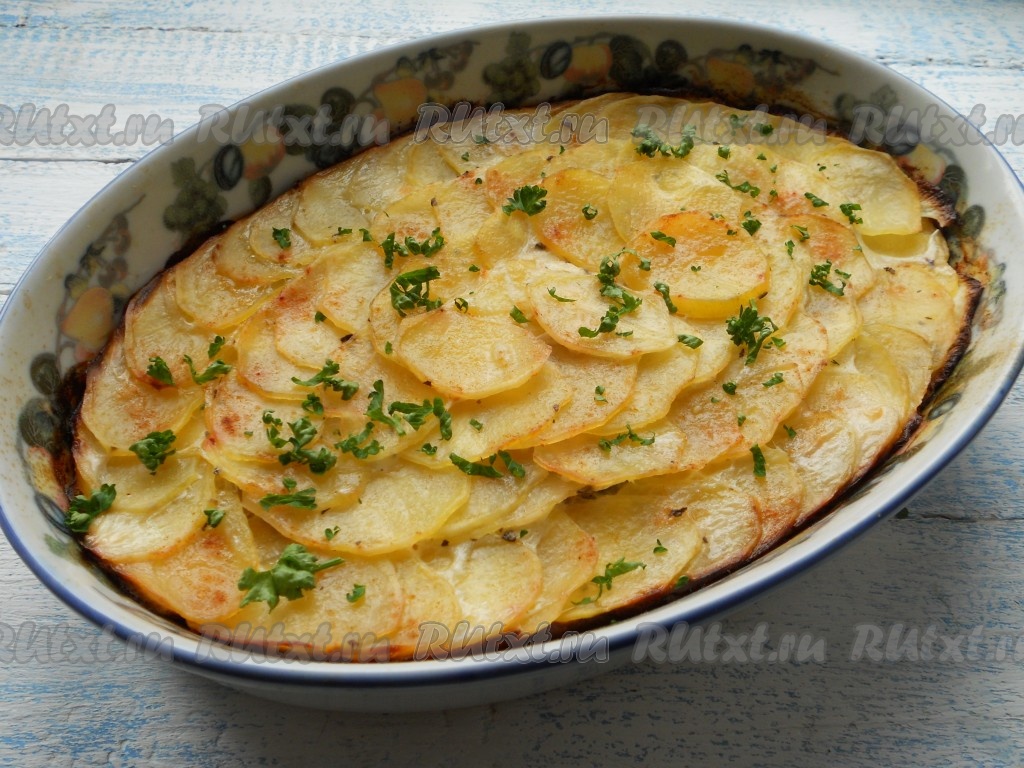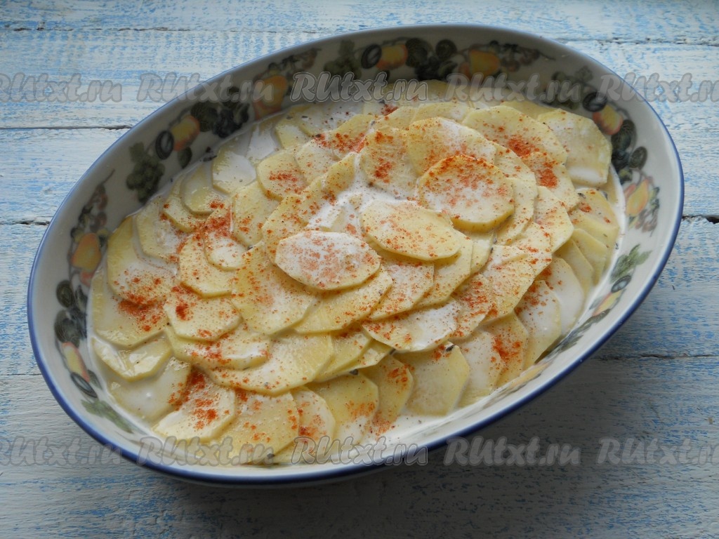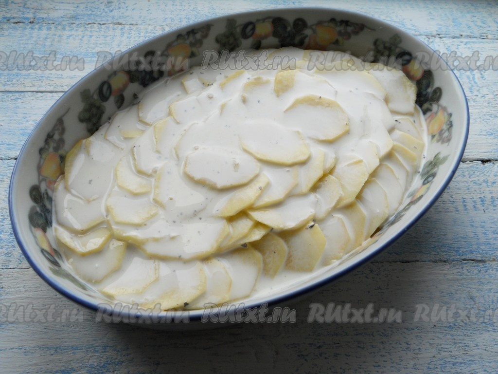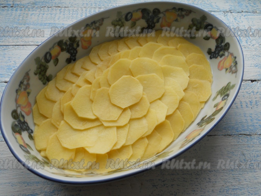 Картофель очистить и нарезать очень тонкими кружочками (для этого подойдет шинковка для капусты или специальная терка). Выложить половину картофеля внахлест в форму для запекания.