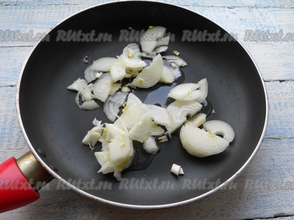 В сковороду влить подсолнечное масло, добавить нарезанный полукольцами репчатый лук.