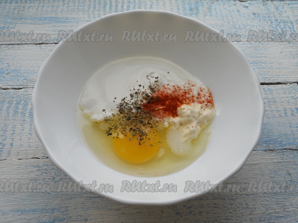 К яйцу добавить сметану, майонез, базилик и паприку, посолить по вкусу, тщательно перемешать вилкой.