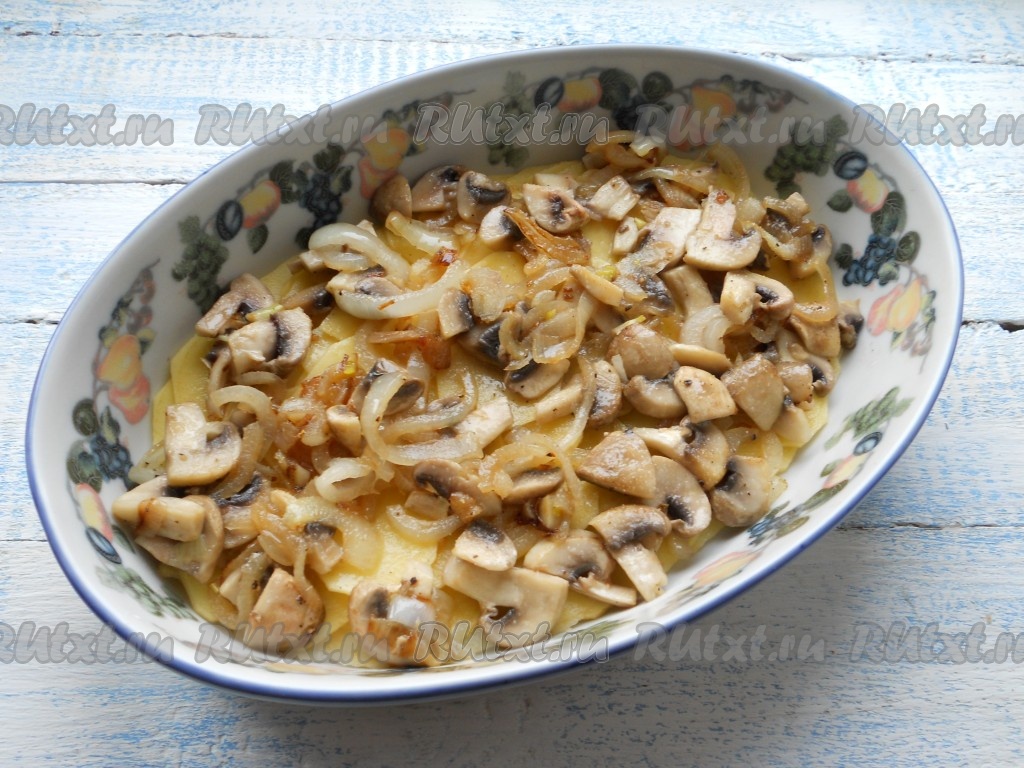 Сверху грибов выложить внахлёст оставшиеся кружочки картофеля и залить всё подготовленной яично-сметанной смесью.