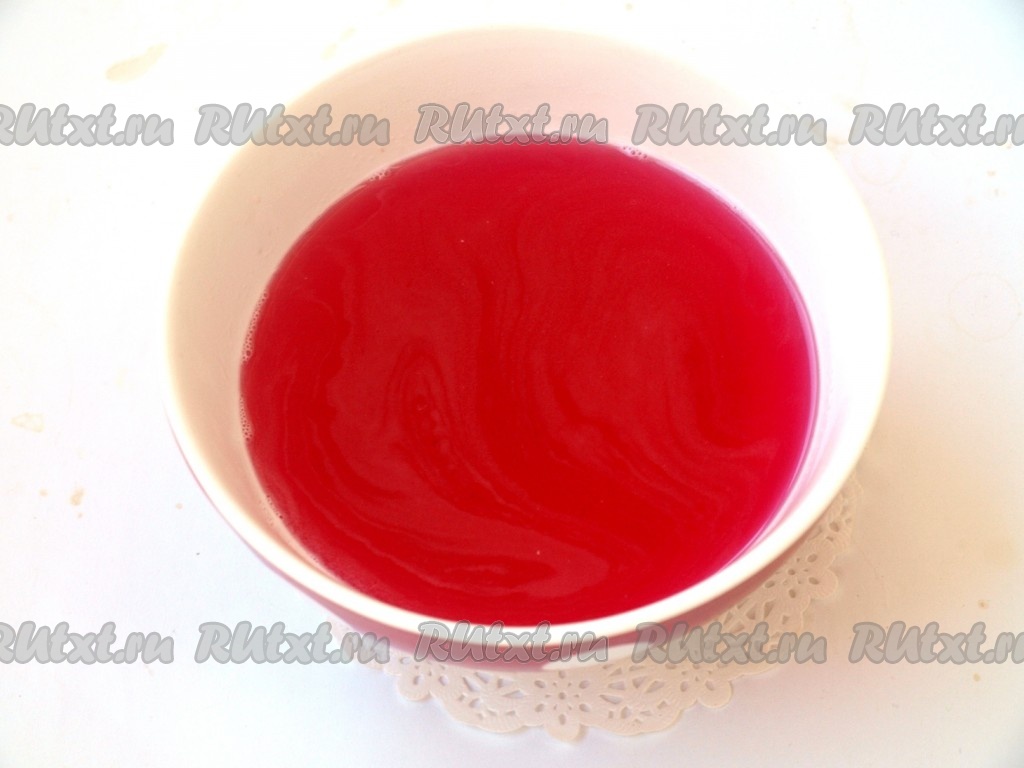 Пачку желе высыпать в глубокую тарелку и залить стаканом горячей воды, хорошо размешать. Желе в данном случае можно брать с любым наполнителем. Дождаться, пока желе остынет.
