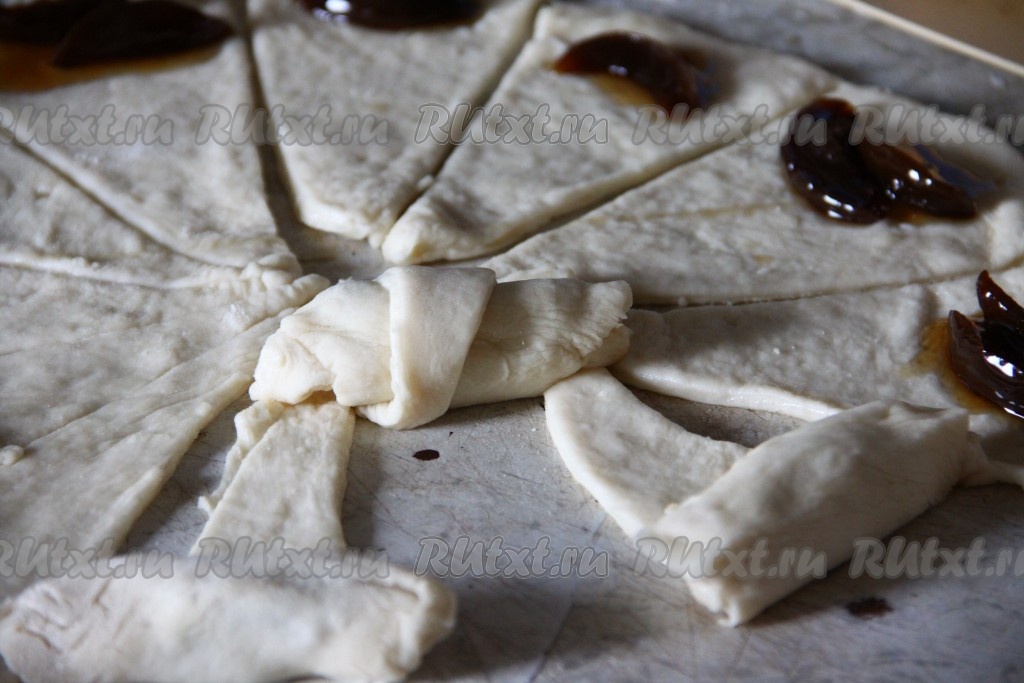 Ближе к основанию треугольника, немного отступив от края, выкладываем повидло и сворачиваем тесто, начиная со стороны с начинкой, формируя рогалик. Аналогично формируем все рогалики.