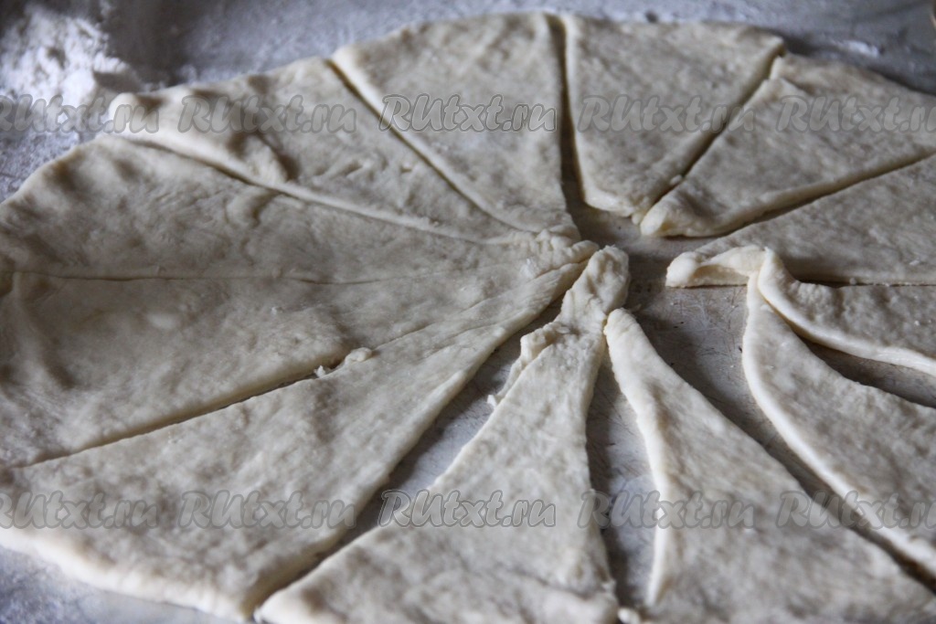 На столе, присыпанном мукой, каждую часть теста раскатываем в круг и разрезаем на 12 треугольников.