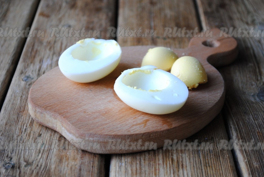 Яйца осторожно разрезать вдоль на половинки и вынуть желтки.