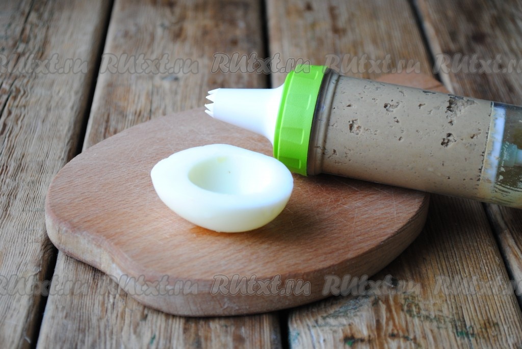 Затем заполнить половинки белков нежной яично-печеночной массой.