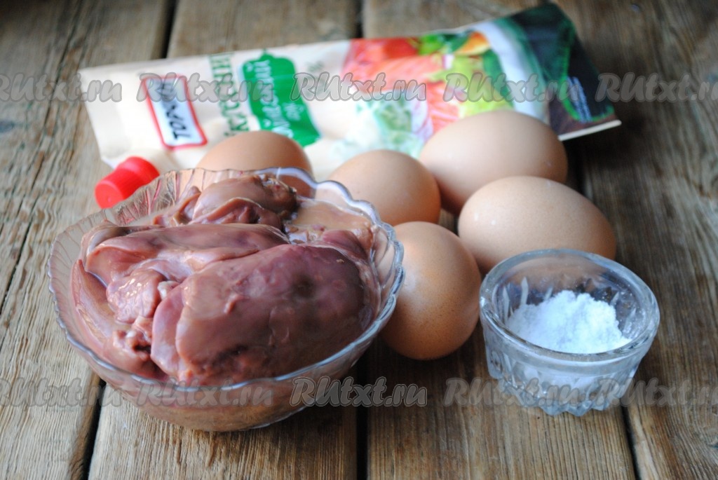 Яйца полностью залить холодной водой, поставить на огонь, после закипания уменьшить огонь и варить в течение 10 минут с момента закипания. Когда яйца сварятся, воду слить и залить их холодной водой. Остывшие яйца очистить от скорлупы. Печень вымыть холодной проточной водой, удалить прожилки. Сковороду разогреть с небольшим количеством растительного масла и выложить подготовленную печень. Обжарить печень на среднем огне по 5-7 минут с каждой стороны. Добавить соль и чёрный молотый перец по вкусу.