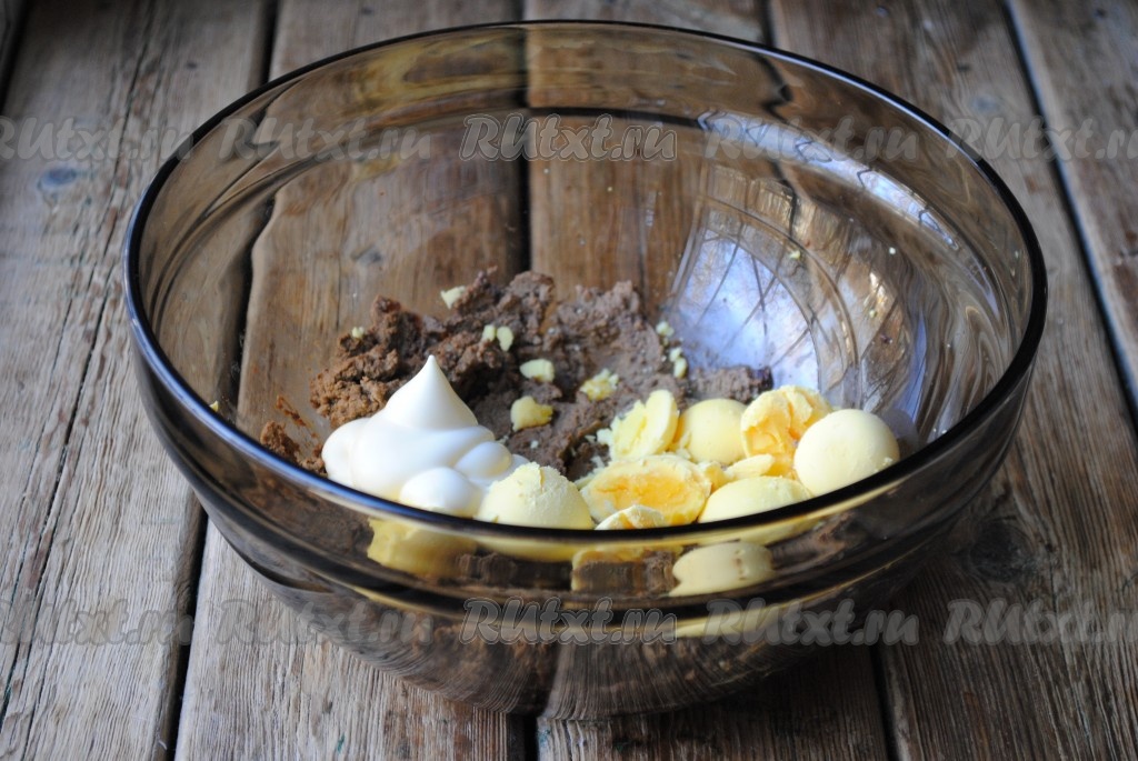 Желтки и майонез добавить к печени (если нужно, немного посолите), взбить блендером до однородной массы. Получившийся яично-печёночный паштет не должен быть очень сухим, его консистенцию можно регулировать майонезом или же добавить кусочек сливочного масла.