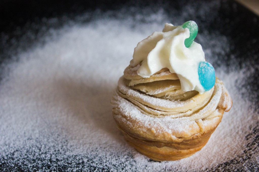 Острым ножом прорезаем рулет вдоль так, чтобы слои теста легко отходили друг от друга и не слиплись. Скатываем разрезанный рулет в форме булочки, выворачивая слои теста наружу, как на фото.