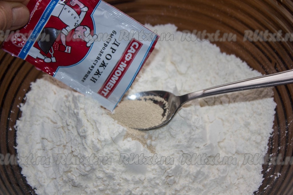 В глубокую миску просеиваем муку. Добавляем к ней дрожжи, тщательно перемешиваем. К муке и дрожжам всыпаем сахар. Добавляем соль и еще раз тщательно перемешиваем.