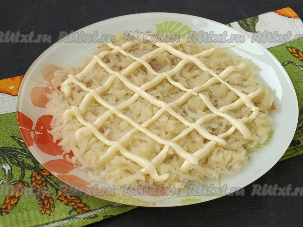 Отварной очищенный картофель натереть на тёрке и выложить первым слоем, нанести майонезную сетку.