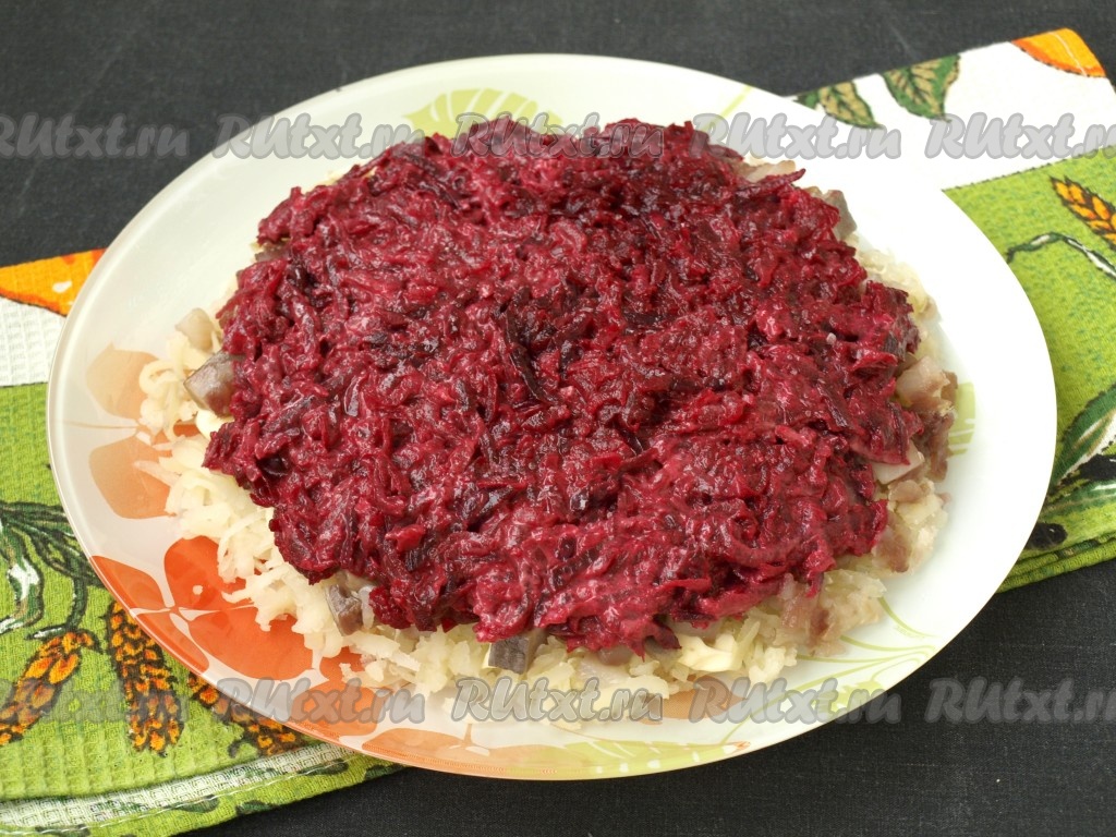 На отдельную тарелку натереть очищенную свеклу, выдавить чеснок, добавить майонез и перемешать. Получившуюся свекольную массу выложить поверх сельди.
