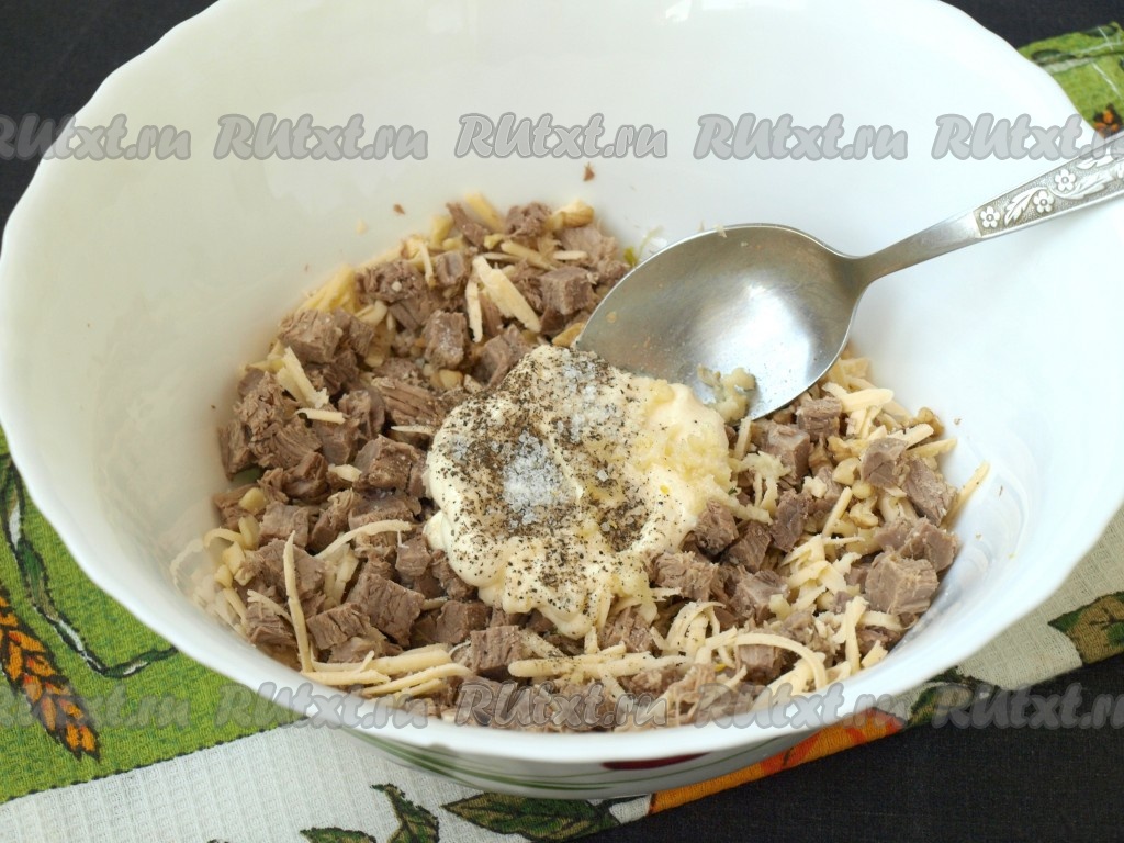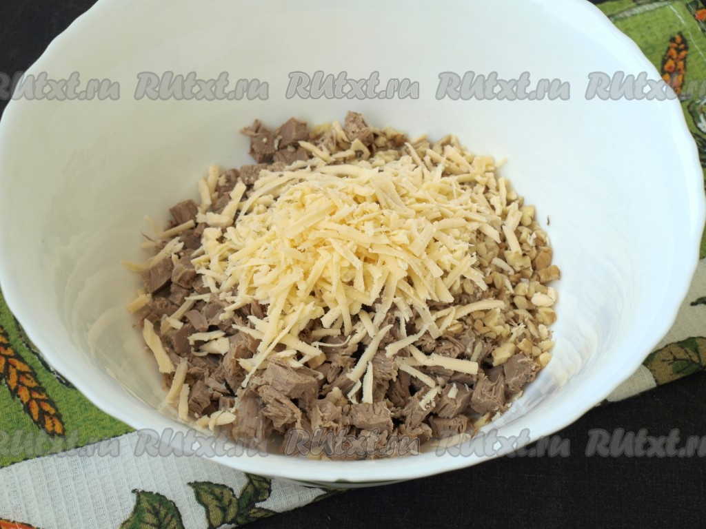 Сыр, натерев на тёрке, выложить в салат к говядине и грецким орехам.