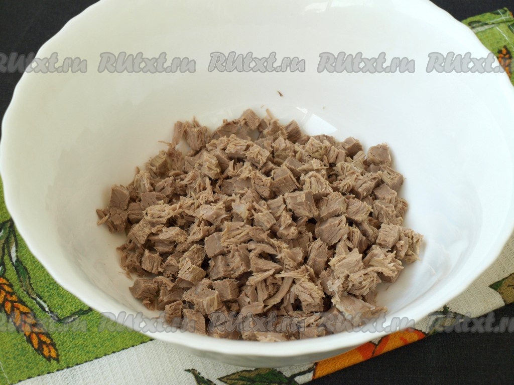 Заранее сваренную говядину нарезать кубиками и сложить в глубокую миску.