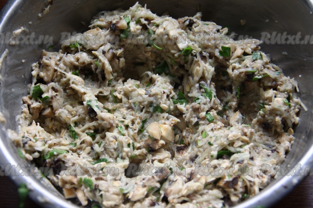 К набухшей овсянке добавляем натертые на мелкой терке лук и картофель, измельченные грибы и зелень, выдавленный чеснок, соль и перец.