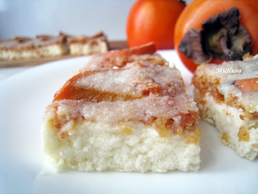 Затем распределить по начинке дольки хурмы, посыпать 1 столовой ложкой манки и поставить творожную запеканку в разогретую духовку примерно на 35-45 минут при температуре 180 градусов.