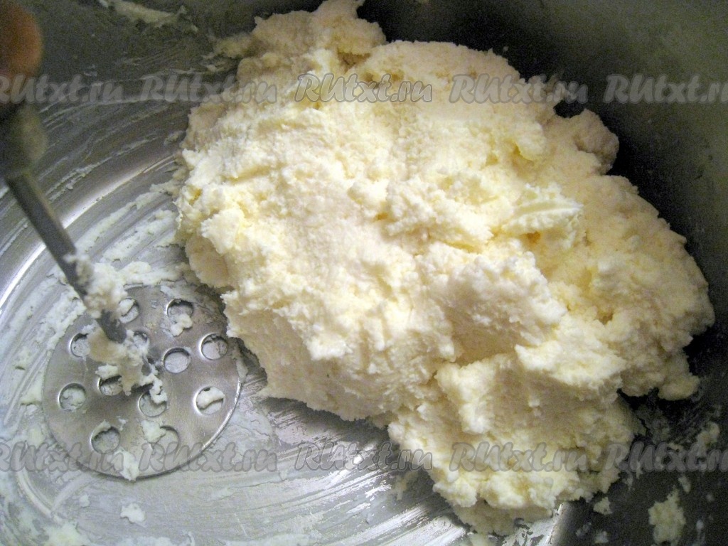 Творог, сахар, масло, манку и ванильный сахар растереть до однородности и перемешать.