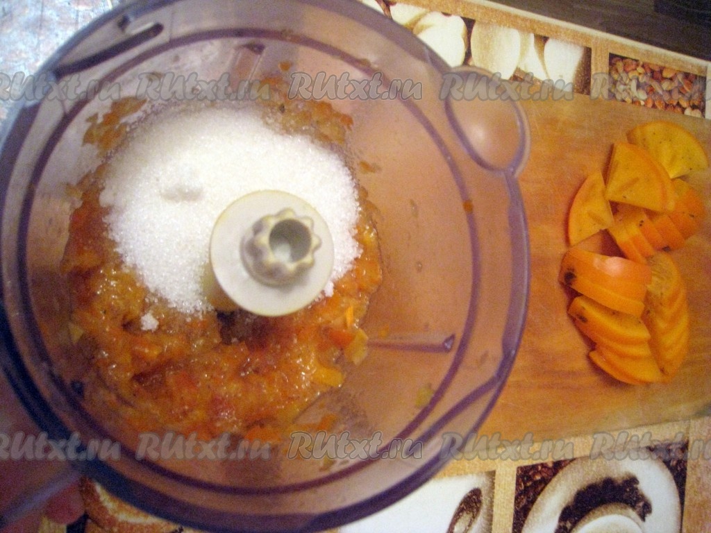 Для начинки измельчить 2-3 хурмы в блендере, перемешать с сахаром и двумя столовыми ложками манки, а одну хурму нарезать на дольки.