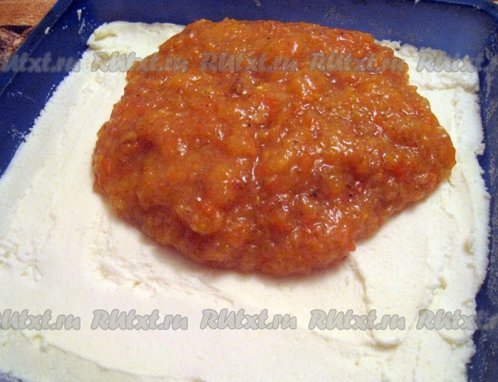 Творожную массу выложить в форму (в силиконовую или смазанную маслом металлическую или керамическую и т.п.), разровнять и сверху выложить начинку из хурмы.
