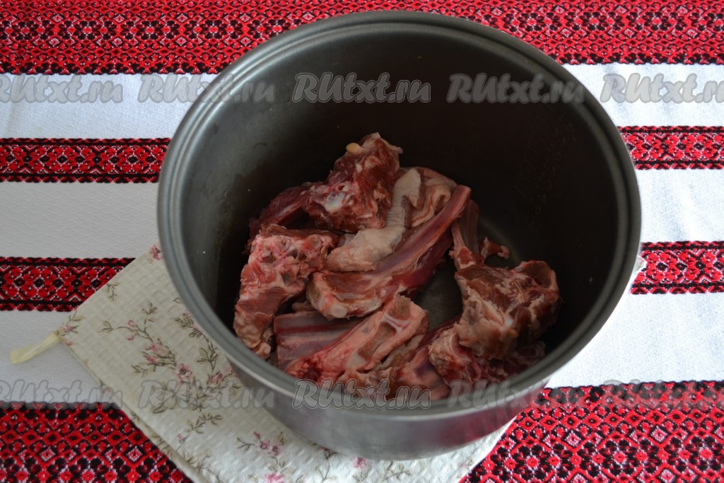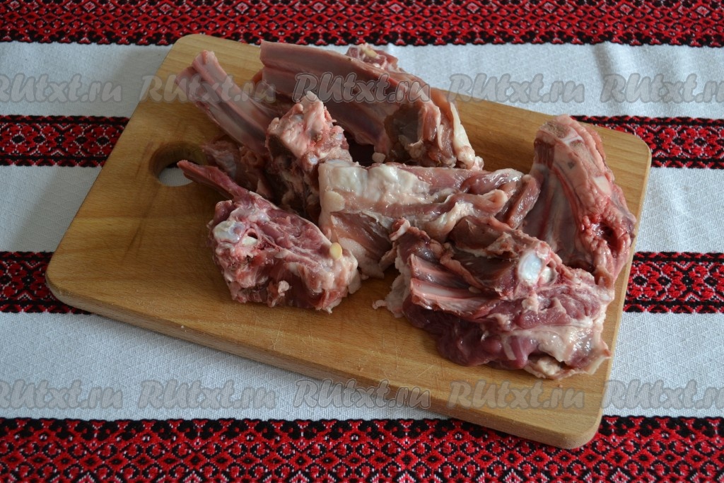 Бараньи ребра разрубить на небольшие порционные кусочки. Можно разрубить и на крупные кусочки, но они будут не очень эстетично смотреться в готовом виде на обеденном столе.
