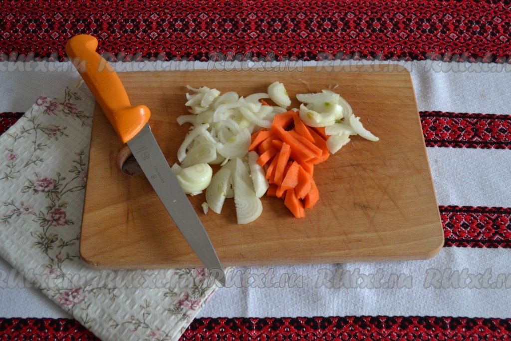 Очистить и нарезать овощи: лук - полукольцами, а морковь - соломкой.