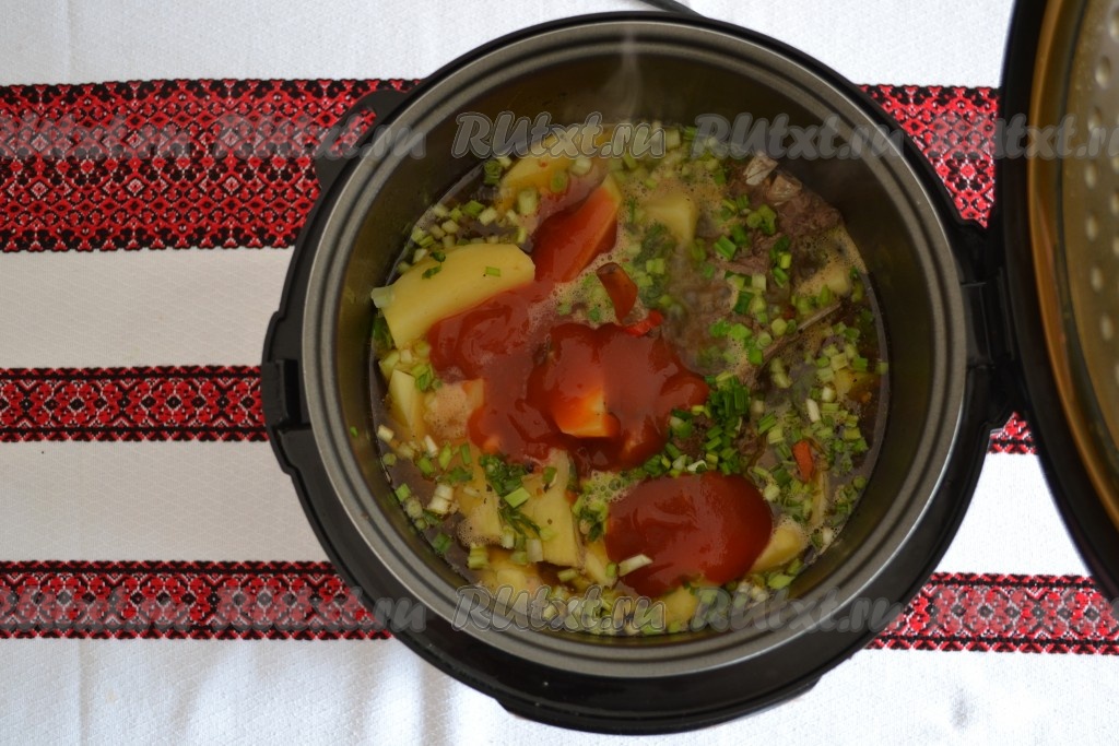 Добавить томатную пасту и нарезанный зеленый лук, продолжить готовить на режиме "Тушение" под закрытой крышкой еще 20 минут.