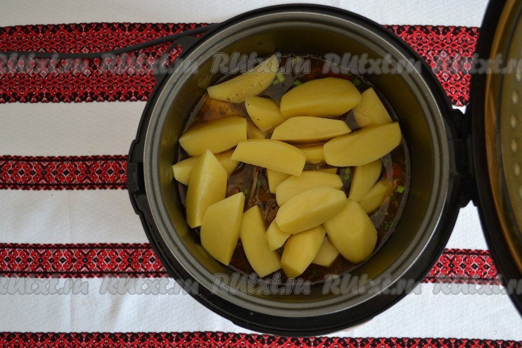 Очищенный картофель разрезать на 4 части (можно и мельче) и выложить к мясу.