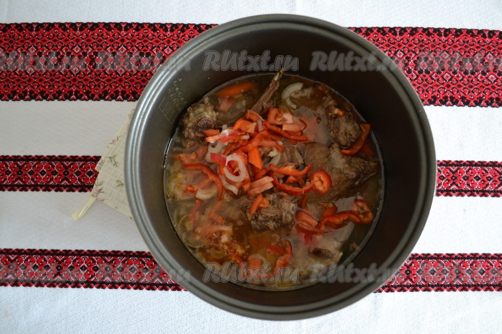 Перец очистить от плодоножки и семян, нарезать соломкой. Помидоры нарезать мелким кубиком. После окончания режима "Тушение" выложить перец и помидоры в чашу мультиварки.