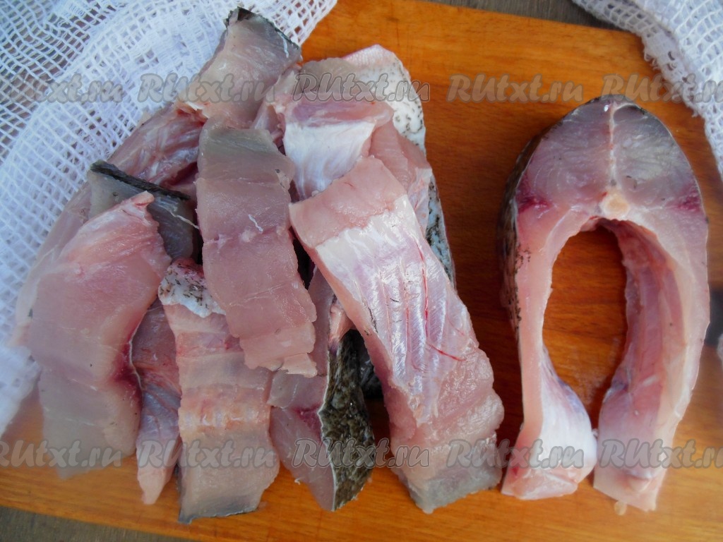Нарежьте толстолобика на порционные кусочки. У меня рыба была крупная, поэтому я её разрезала на 4 стейка (кусочка), затем каждый стейк разделила на 2 части (получится 8 кусочков). Если и в этом случае кусочки получились крупными (как на фото), можно каждый - разрезать ещё на 2 части, чтобы получилось 16 кусочков толстолобика.