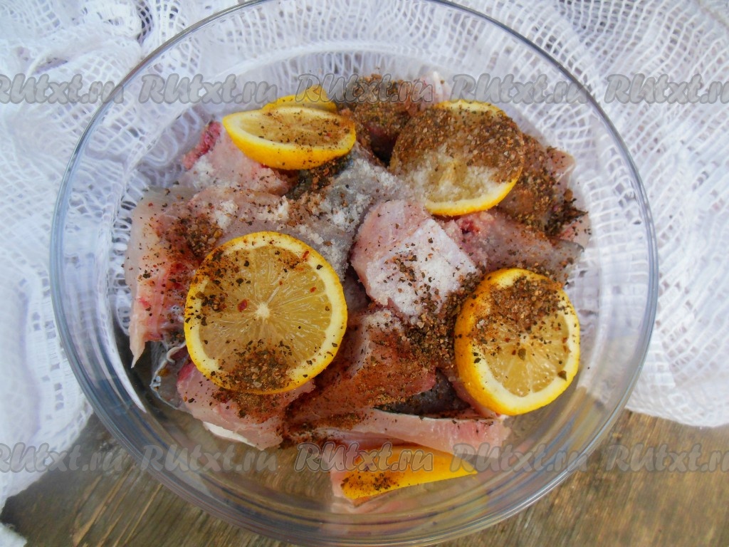 Посолите кусочки толстолобика, добавьте смесь перцев и колечки лимона (их необходимо слегка раздавить руками, чтобы выделился сок), хорошо перемешайте и оставьте мариноваться на 20-30 минут. Иногда я оставляю рыбу мариноваться на всю ночь, для этого ставлю ее в холодильник.