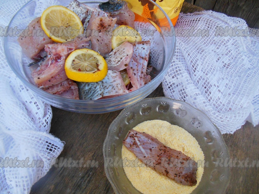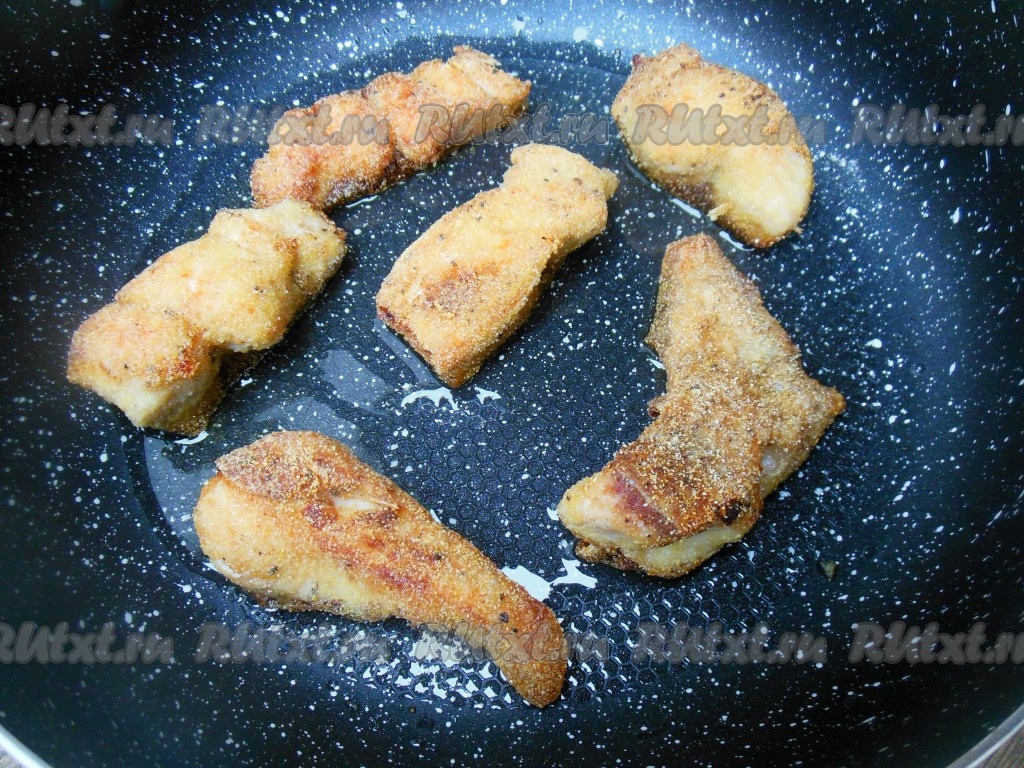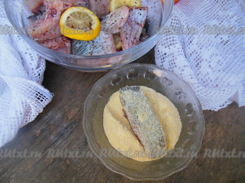 Для панировки у меня сегодня кукурузная мука, с ней получается красивая золотистая корочка. Можно использовать и пшеничную муку. Обваляйте кусочки толстолобика в муке сначала с одной стороны.