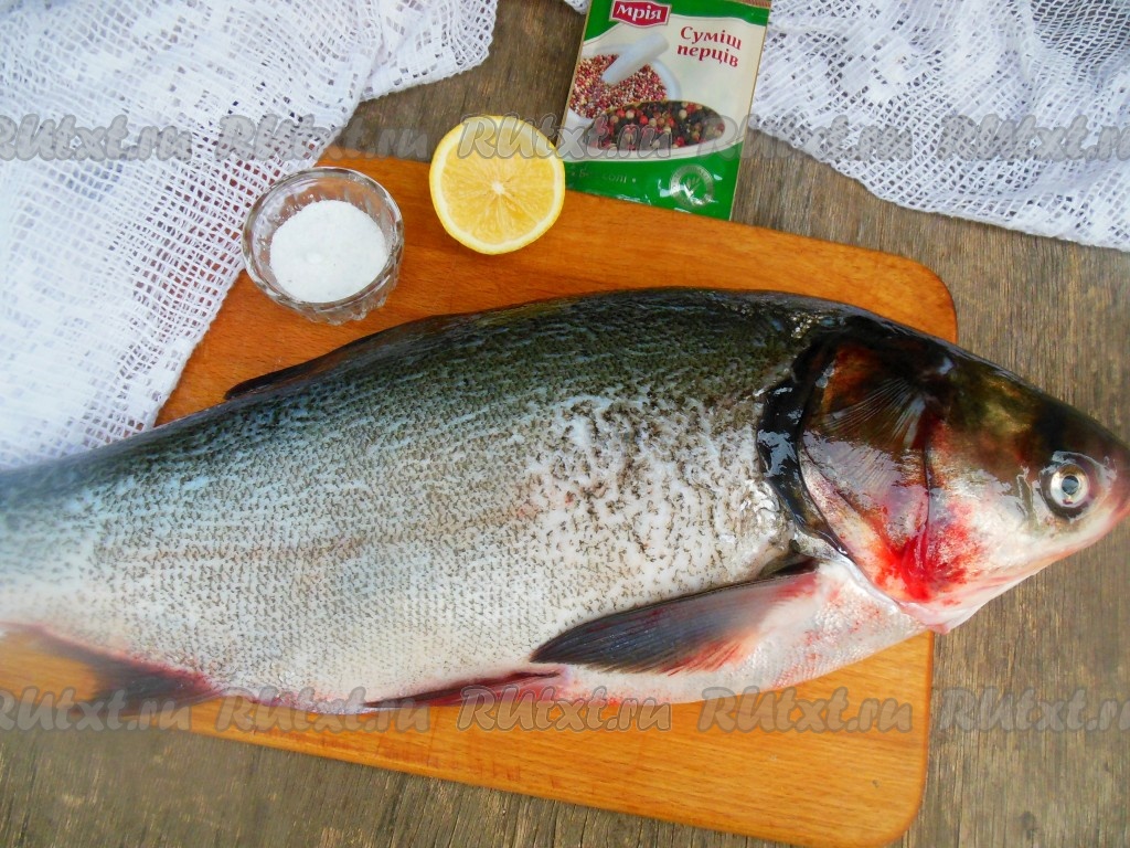 Толстолобика очистите от чешуи и внутренностей, удалите при помощи кухонных ножниц плавники. Отрежьте голову и хвост. Из головы удалите жабры, голова пригодится для бульона (например, для ухи). Очищенную рыбу тщательно промойте под проточной водой, уберите черную пленочку внутри.