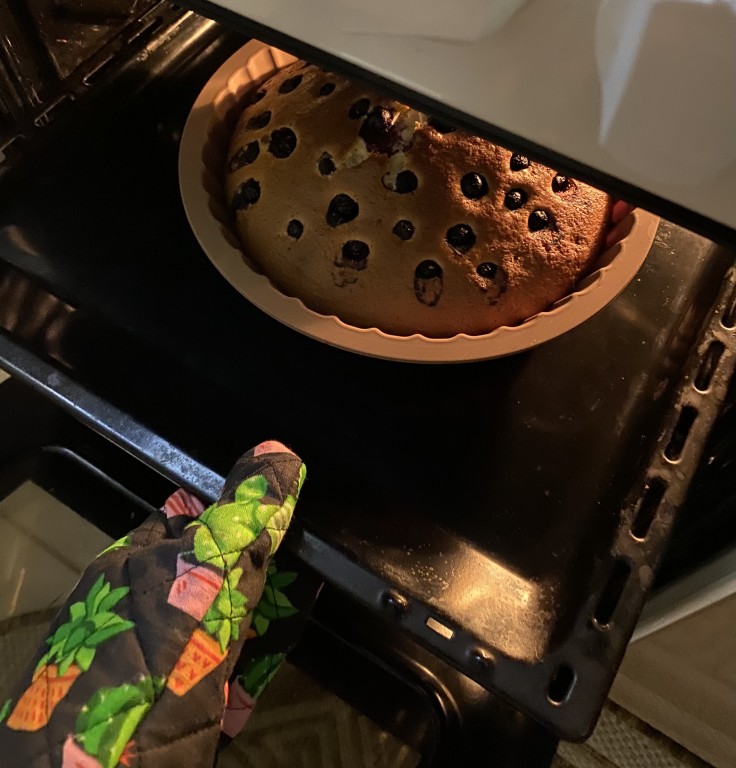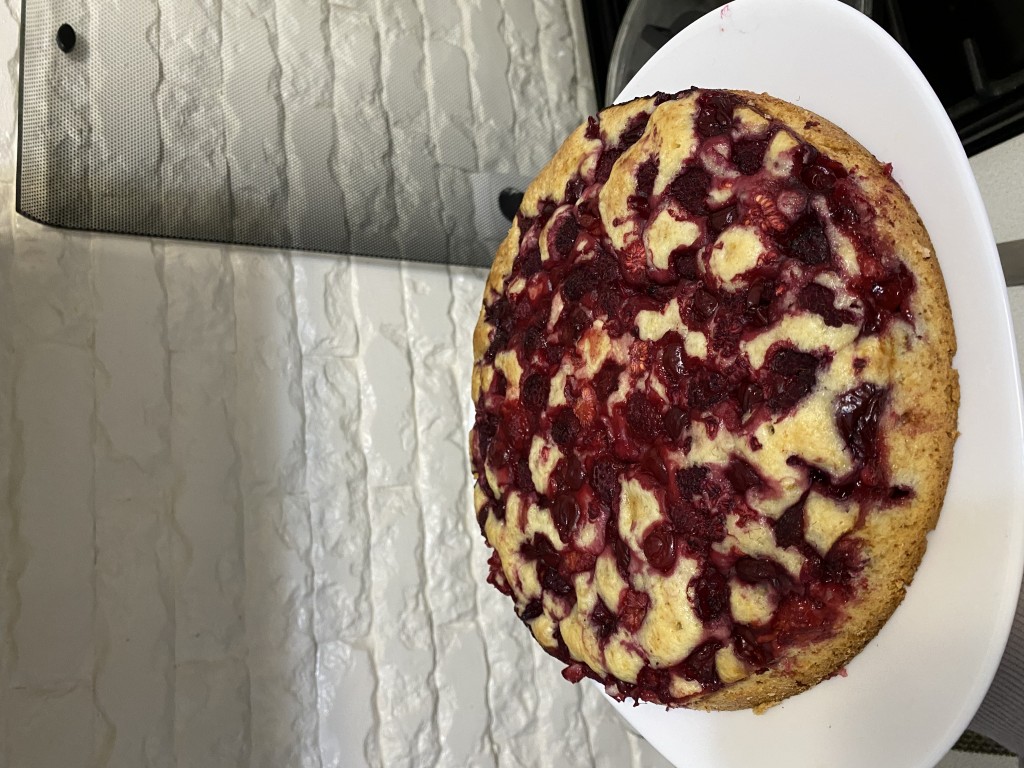 Форму застелить пергаментом, вылить тесто. Сверху произвольно разложить ягоды. Я взяла вишню без косточек и ежевику.