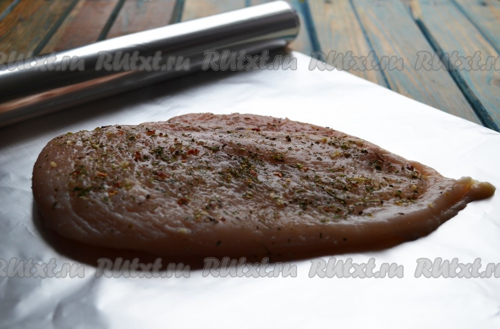 Фольгу свернуть конвертиком и отправить куриное филе в духовку, разогретую до 200 градусов, минут на 15.