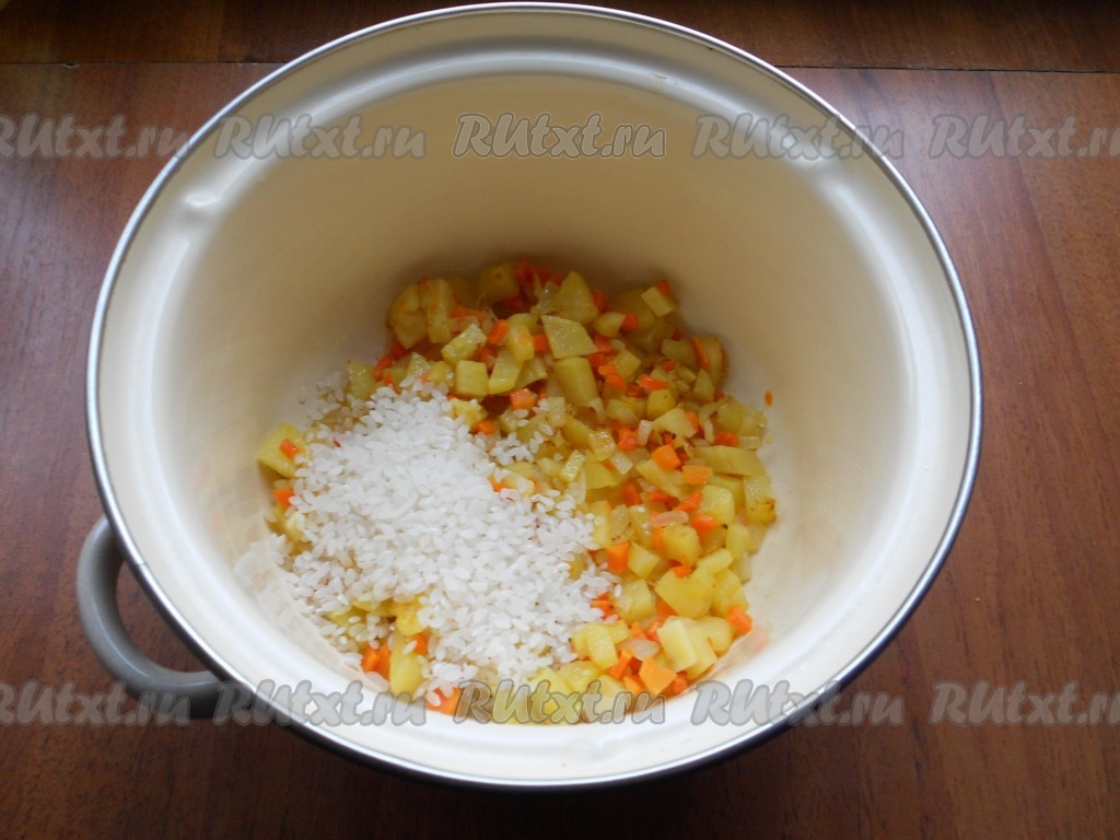 Обжарить овощи в течение 5 минут, помешивая. Выложить обжаренные овощи в кастрюлю, всыпать промытый рис.