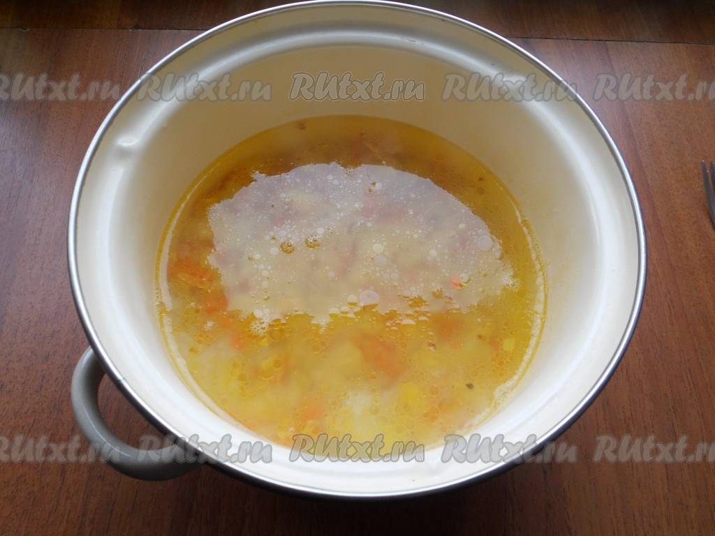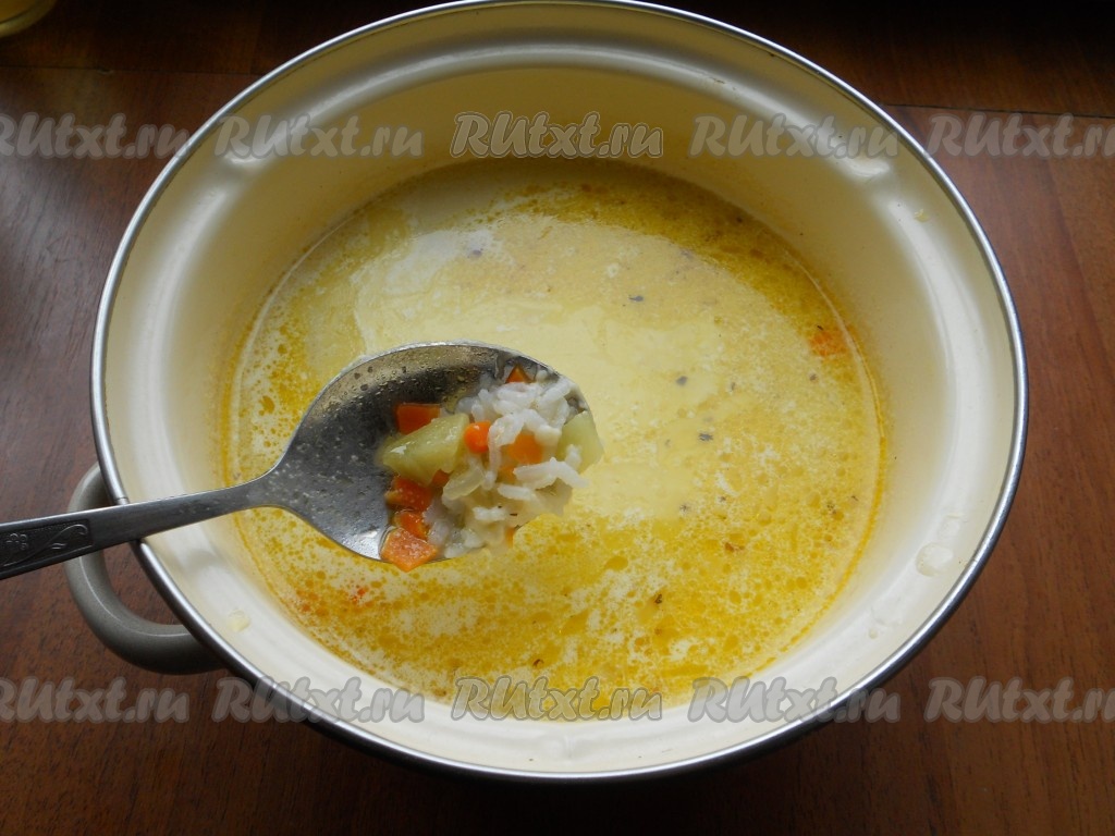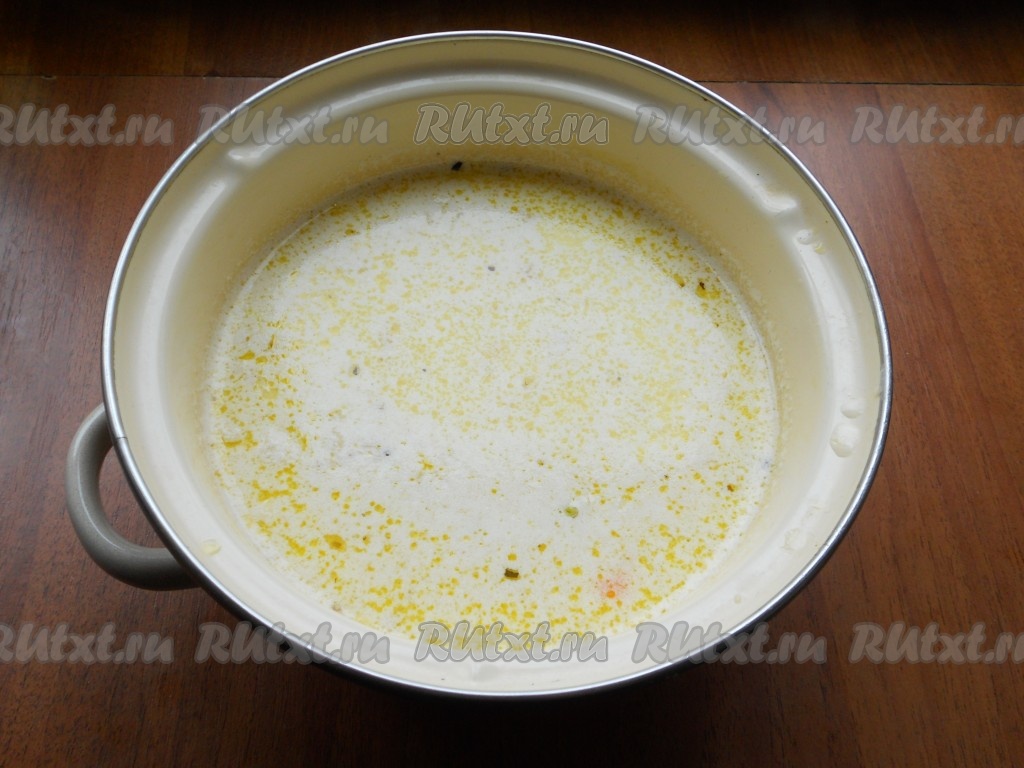 Сливки нагреть и влить в суп. Довести сливочно-сырный суп до кипения, выключить газ, добавить сливочное масло, перемешать. Накрыть кастрюлю крышкой и дать супу настояться минут 10.