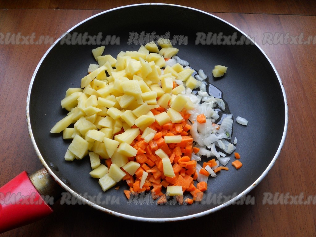Картофель очистить, нарезать небольшими кубиками, добавить в сковороду к луку и моркови.