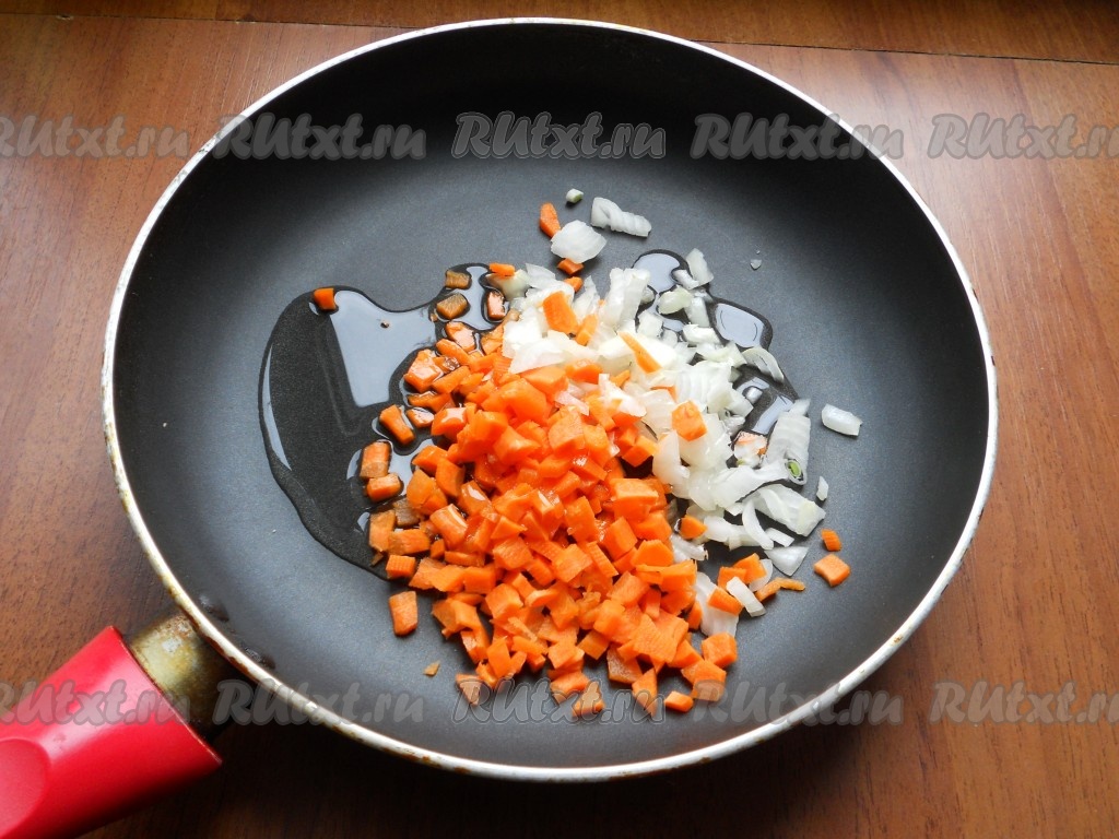 Лук нарезать мелко, морковь - маленькими кубиками, выложить на сковороду, влить растительное масло.
