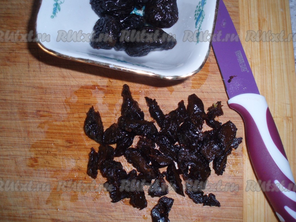 Чернослив вымыть, обсушить, если нужно - освободить от косточек. Нарезать полосками.
