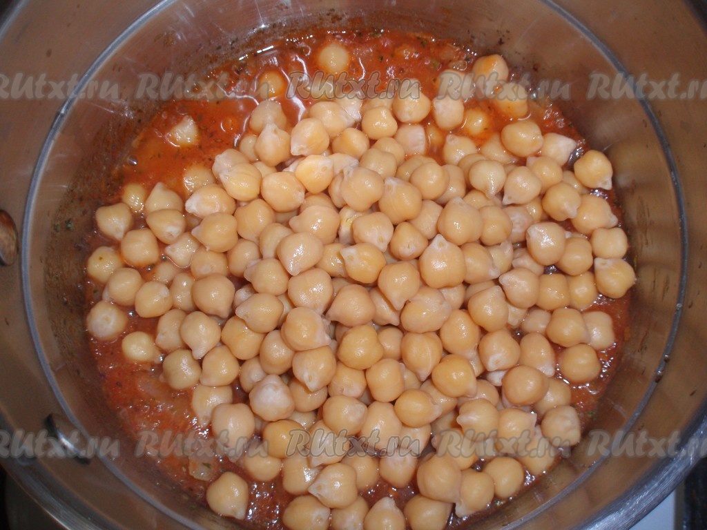 Затем выложить в томатный соус отваренный заранее нут, всыпать прованские травы, перемешать, тушить на маленьком огне 5 минут.