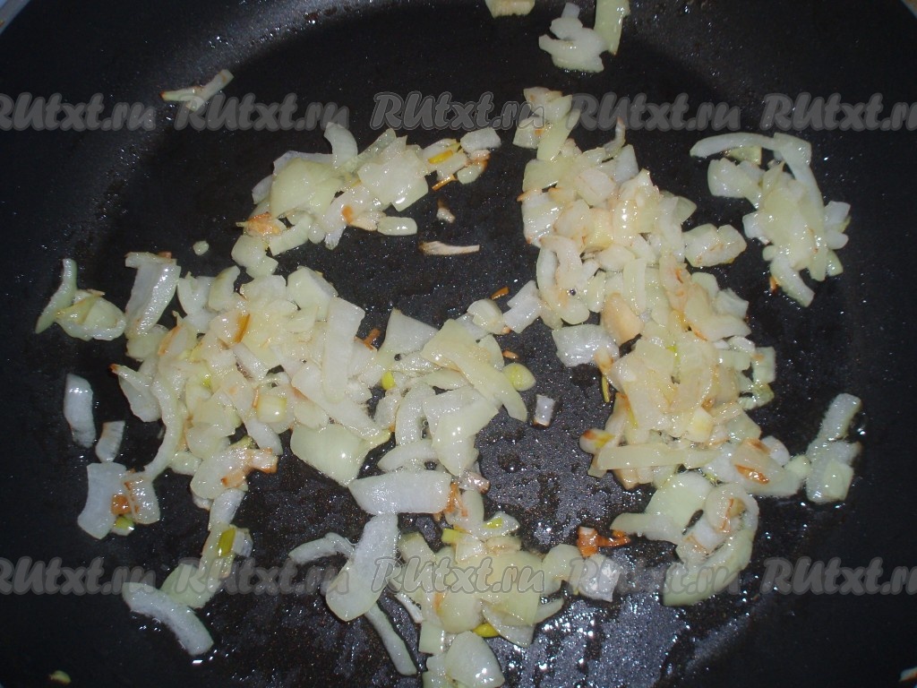 Луковицу мелко нарезать и обжарить на растительном масле, иногда помешивая, до золотистого цвета.
