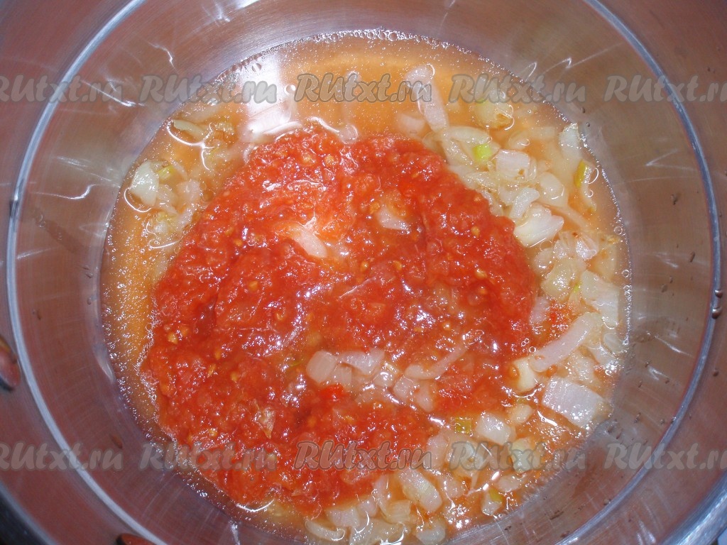Переложить лук в кастрюльку, пригодную для тушения. Подлить полстакана воды, добавить томатный соус, соль, перец, довести до кипения.